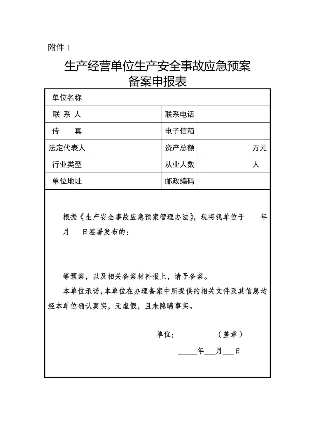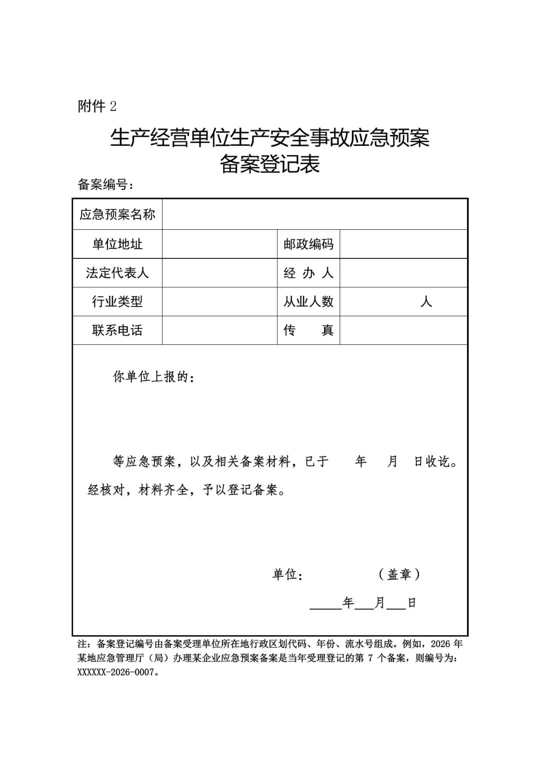 为落实《生产安全事故应急条例》(国务院令第708号)、《国务院办公厅关于印发〈突发事件应急预案管理办法〉的通知》(国办发〔2024〕5号)和《应急管理部关于修改〈生产安全事故应急预案管理办法〉的决定》(应急管理部令第2号)等有关要求,进一步加强和规范生产安全事故应急预案备案办理工作,应急管理部制定了《生产经营单位生产安全事故应急预案备案申报表》《生产经营单位生产安全事故应急预案备案登记表》,现予印发。