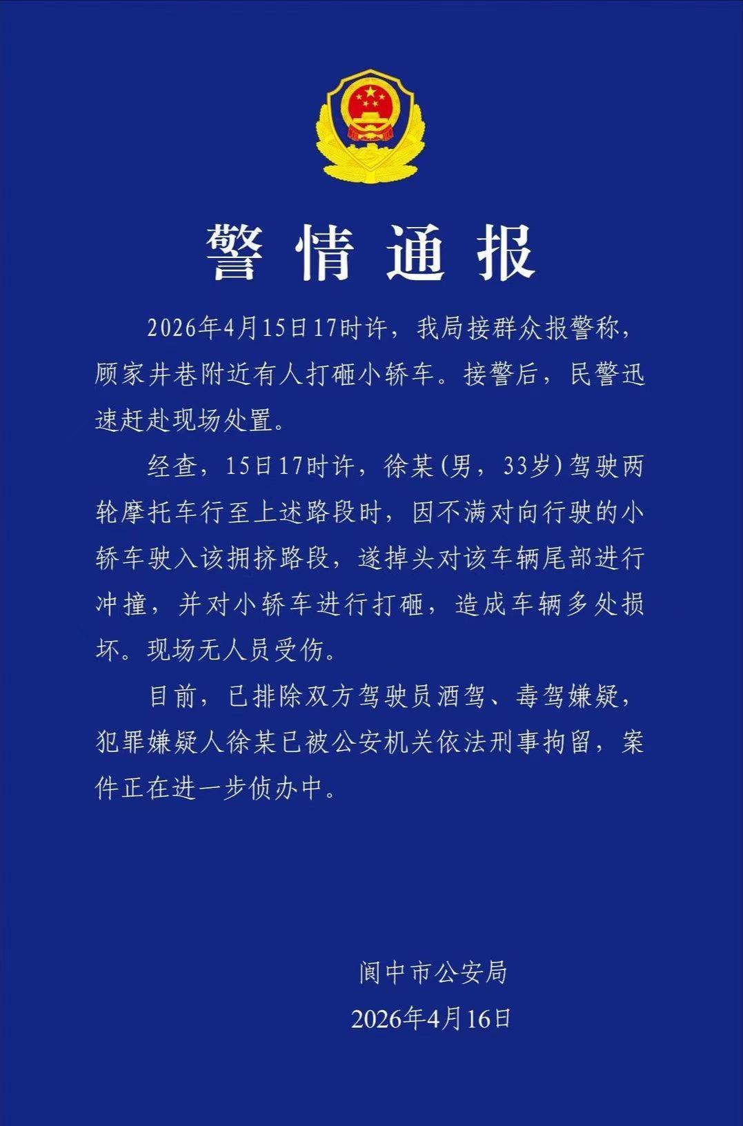 阆中市公安局就此事发布警情通报称,4月15日17时许,该局接群众报警称,顾家井巷附近有人打砸小轿车。接警后,民警迅速赶赴现场处置。