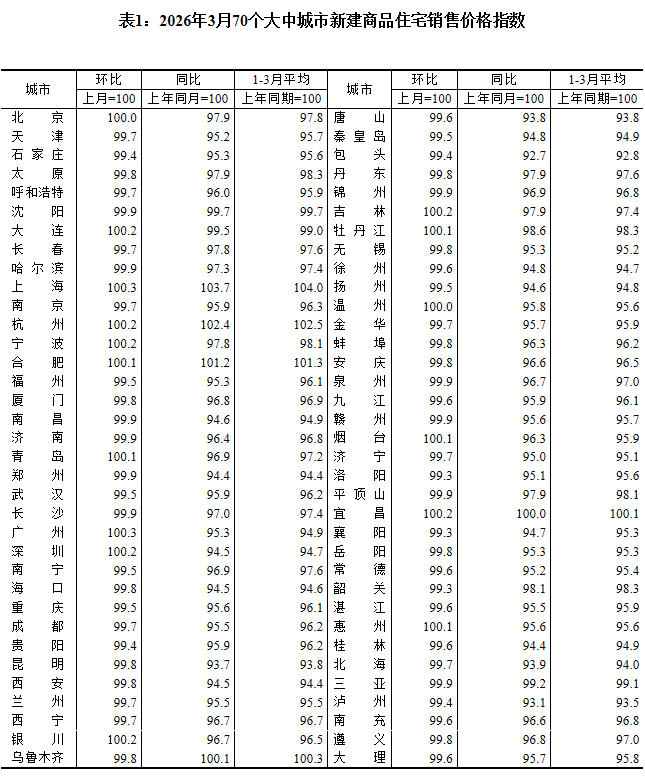 国家统计局4月16日公布数据显示,2026年3月份,70个大中城市中,一线城市商品住宅销售价格环比上涨,二三线城市环比降幅收窄或相同。新建商品住宅和二手住宅销售价格环比上涨城市个数均比上月增加。【阅读详情】