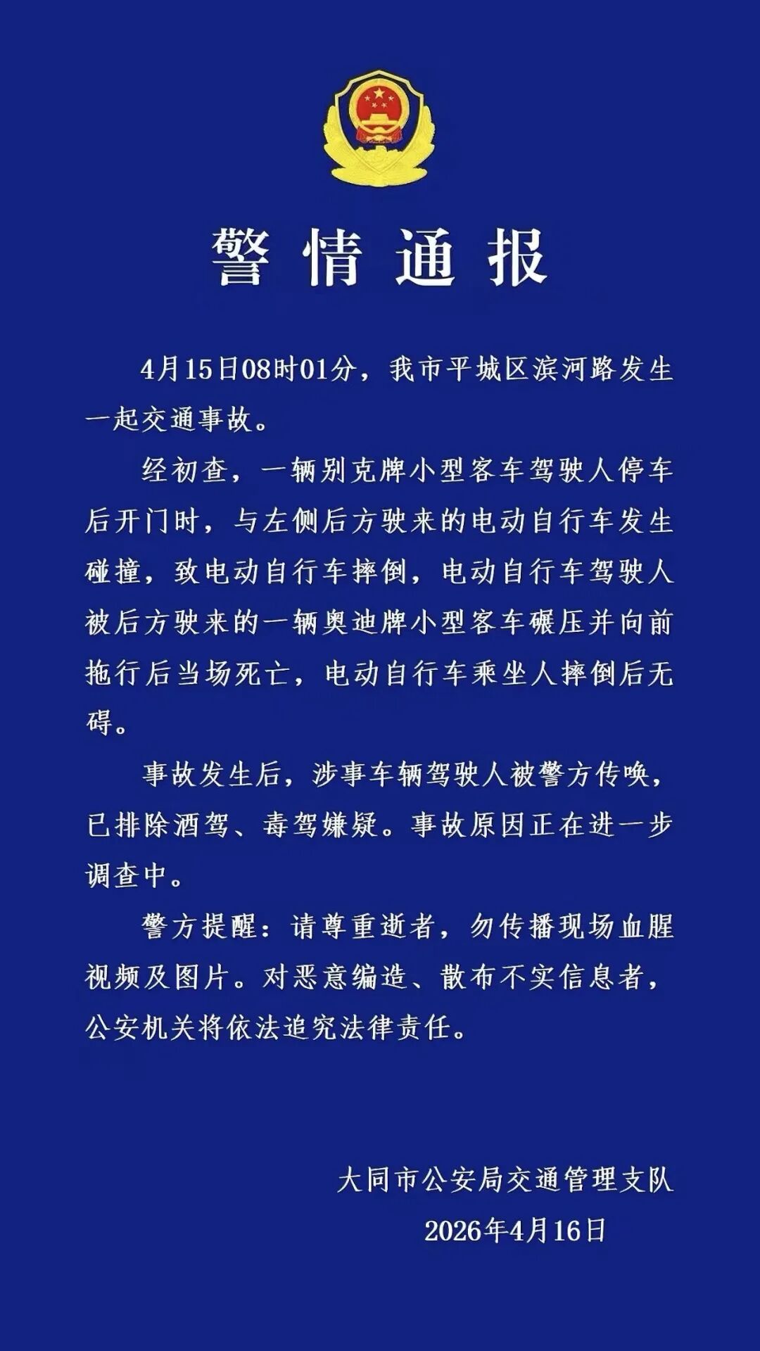 4月15日,山西省大同市平城区滨河路发生一起交通事故。一名男子骑电动车遇“开门杀”,倒地后被后方车辆碾压致死。4月16日,大同市公安局交通管理支队发布警情通报。