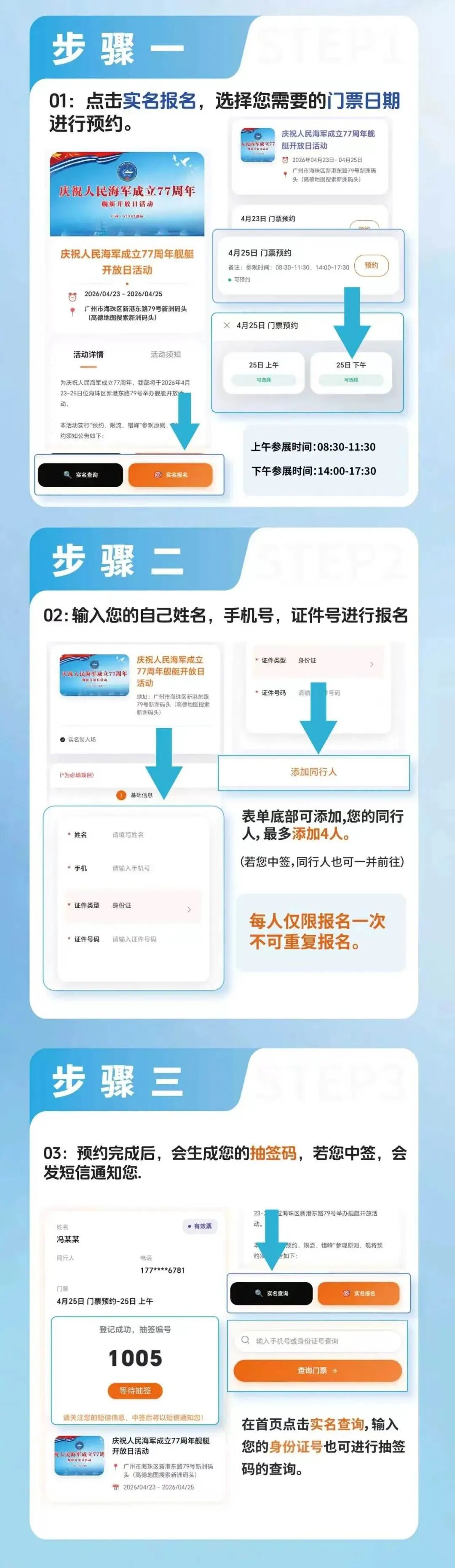 3.参观期间,请自觉接受身份核验和安全检查,不得携带易燃易爆违禁品、危险品、宠物以及大件行李箱包登舰。