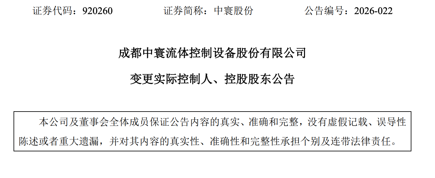 4月15日,成都中寰流体控制设备股份有限公司(下称“中寰股份”)发布公告,因原控股股东、实际控制人李瑜逝世,其持有的公司5360.14万股股份(占总股本51.76%)由罗蓉通过夫妻共同财产分配及遗产继承取得。本次变更后,罗蓉成为公司控股股东、实际控制人,其女李青、女婿张迪作为一致行动人,持股不变。