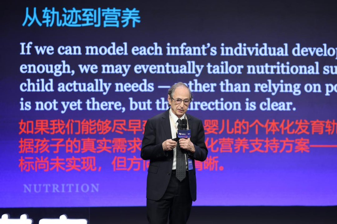 小盖现场以英文向迈克尔・莱维特教授发起学术提问,探讨生命早期营养领域未来3-5 年的研究方向,小盖还就AI机器人能否成为科学喂养主力、解放父母养育压力与教授展开交流,让现场观众直观感受到智能科技与前沿营养科学的融合创新。