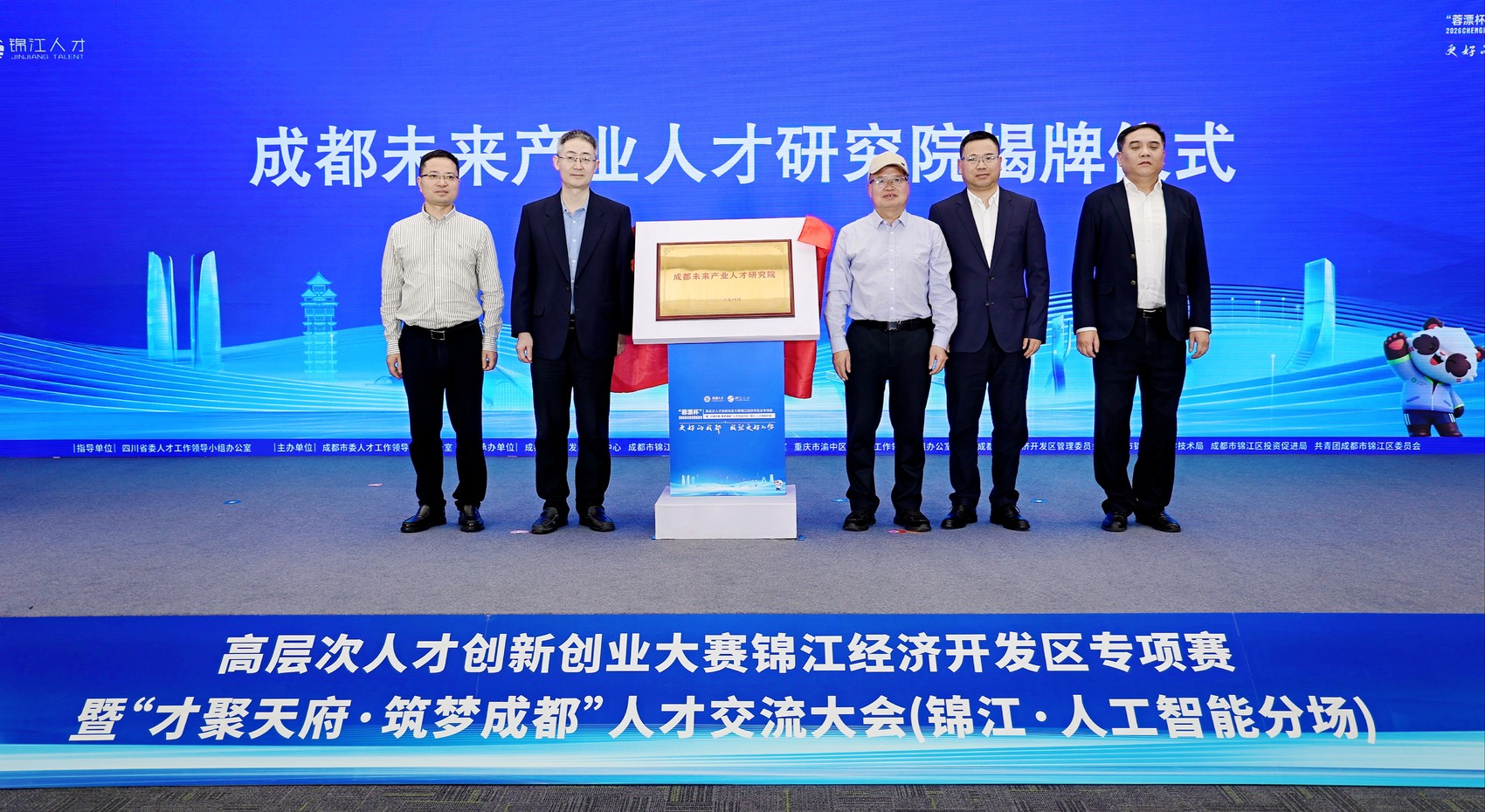 活动现场,成都未来产业人才研究院正式揭牌,落户锦江区。该研究院由成都人才发展集团、上海国研数智管理咨询有限公司、电科天府协同创新(成都)科技有限公司三方共建,以“专业突出、数智赋能、平台生态、机制灵活”为核心定位,致力打造面向未来产业的人才专业智库。同时,研究院创新采用“国企牵头、多方协同、市场化运作”组建模式,围绕人才“引育留用评”全链条,构建起“数据驱动+AI赋能+枢纽链接”三维服务体系。