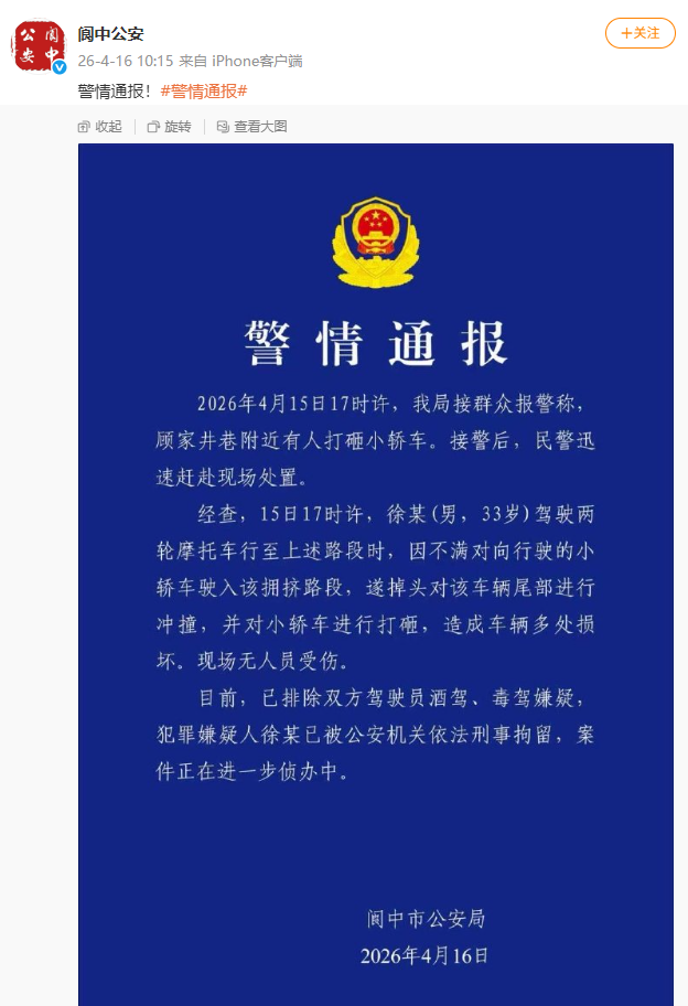 通报称,2026年4月15日17时许,该局接群众报警称,顾家井巷附近有人打砸小轿车。接警后,民警迅速赶赴现场处置。