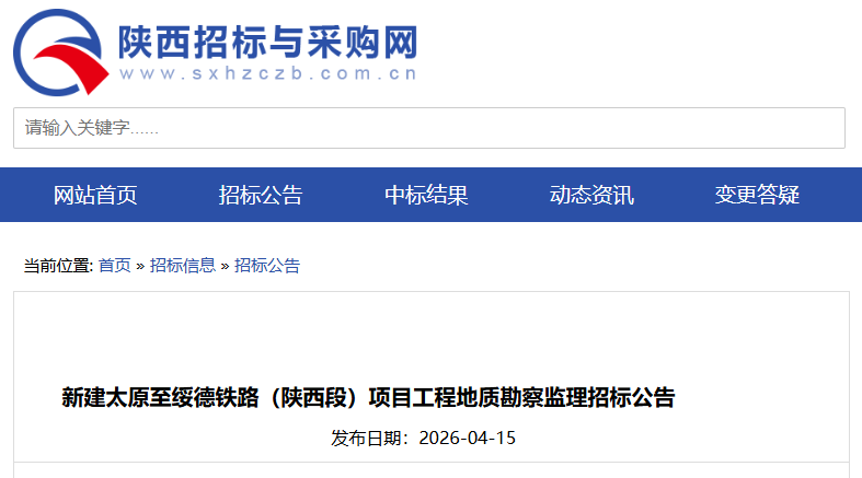 4月15日,新建太原至绥德铁路(陕西段)项目工程地质勘察监理招标公告发布,太绥高铁陕西段已进入初步设计定测阶段,将力争在年内具备开工条件。