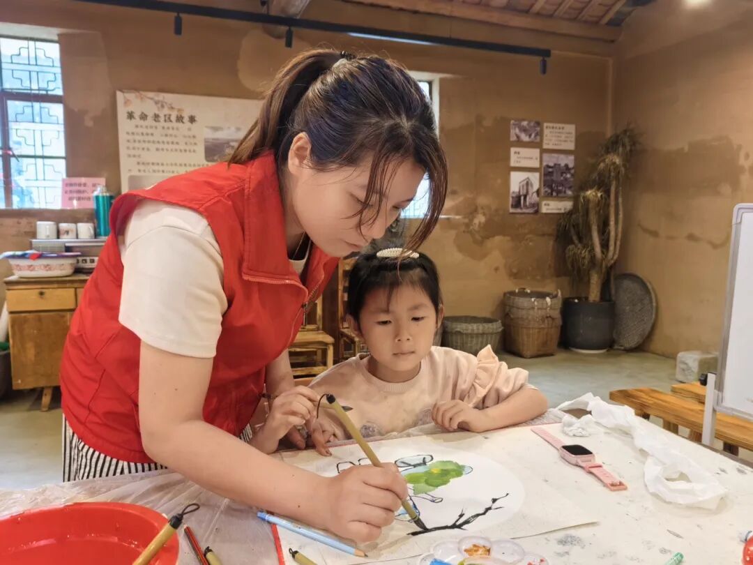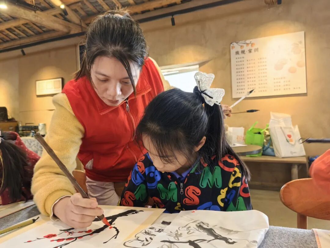 她也把这份理解融入教学。在国画课上,她握着孩子们的手描绘柿子,轻声讲述:“柿子长在哪棵树上,就把哪棵树当家。我们来到茜坑,这里就是我们的家。”