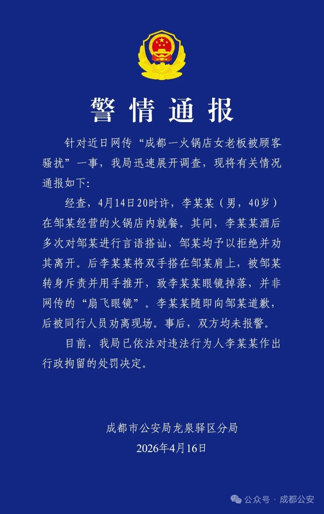 针对近日网传“成都一火锅店女老板被顾客骚扰”一事,该局迅速展开调查,经查,4月14日20时许,李某某(男,40岁)在邹某经营的火锅店内就餐。其间,李某某酒后多次对邹某进行言语搭讪,邹某均予以拒绝并劝其离开。后李某某将双手搭在邹某肩上,被邹某转身斥责并用手推开,致李某某眼镜掉落,并非网传的“扇飞眼镜”。李某某随即向邹某道歉,后被同行人员劝离现场。事后,双方均未报警。
