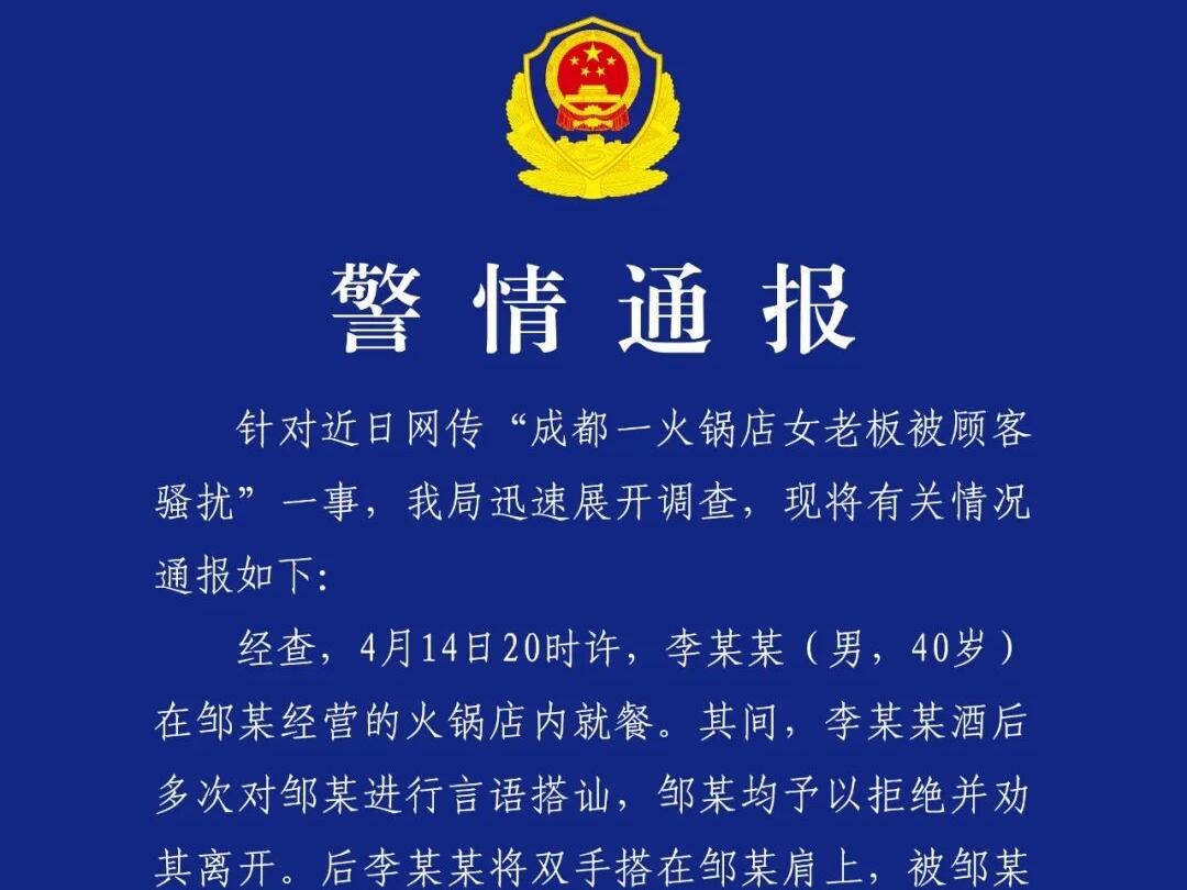 成都一男子酒后骚扰火锅店老板,伸“咸猪手”说想“捧女主角”,警方通报:该男子已被行拘。