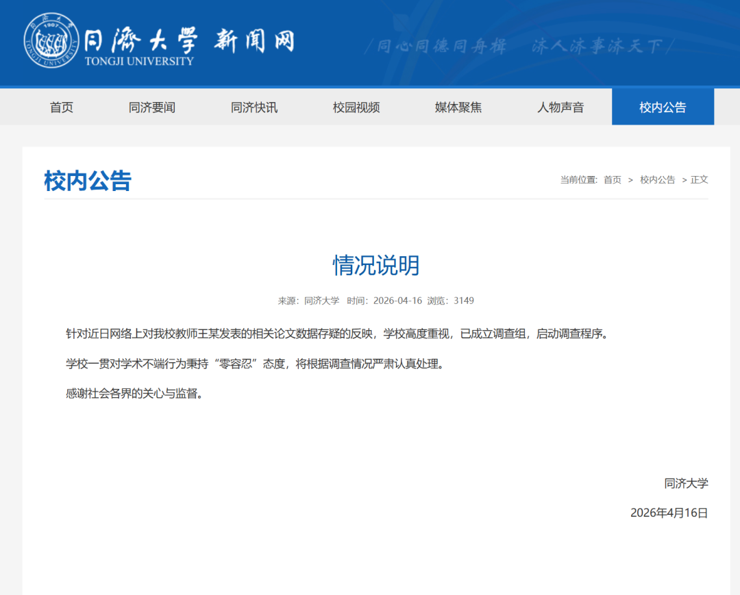 针对近日网络上对我校教师王某发表的相关论文数据存疑的反映,学校高度重视,已成立调查组,启动调查程序。