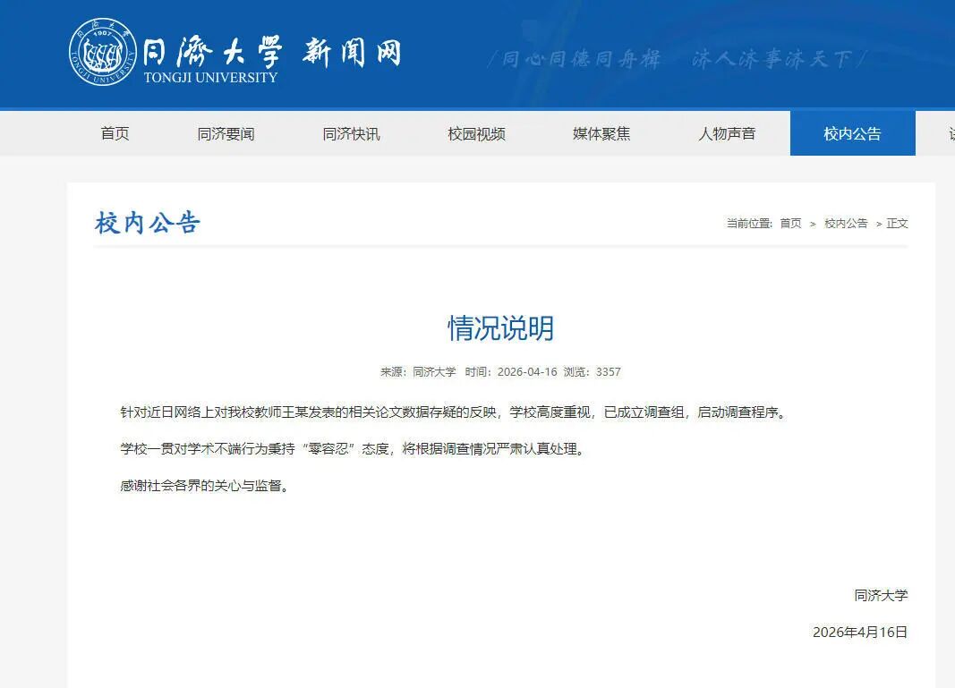 4月16日,同济大学发布情况说明:针对近日网络上对我校教师王某发表的相关论文数据存疑的反映,学校高度重视,已成立调查组,启动调查程序。学校一贯对学术不端行为秉持“零容忍”态度,将根据调查情况严肃认真处理。