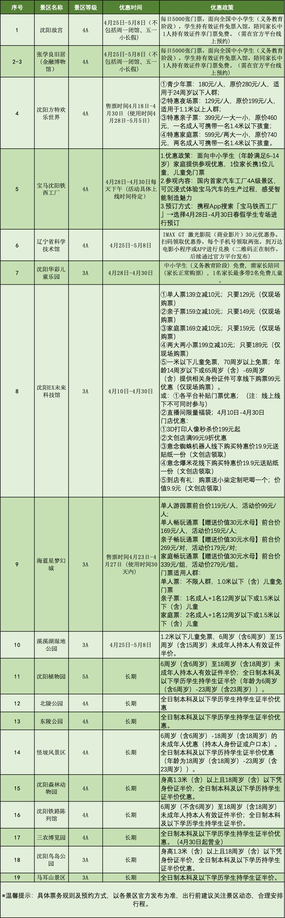 春假期间,沈阳方特青少年票低至180元,还有亲子票、家庭票特惠;6-14岁学生参观宝马铁西工厂可免票;华彩儿童乐园中小学生免费;EX未来科技馆、海蓝星梦幻城、溪溪湖湿地均有学生专属低价;辽宁省科技馆还能领IMAX影院30元优惠券。沈阳植物园、北陵公园、东陵公园、怪坡、森林动物园等 9家重点景区,学生持学生证享半价优惠。(优惠详见表格,具体票务规则及预约方式,以各景区官方发布为准)