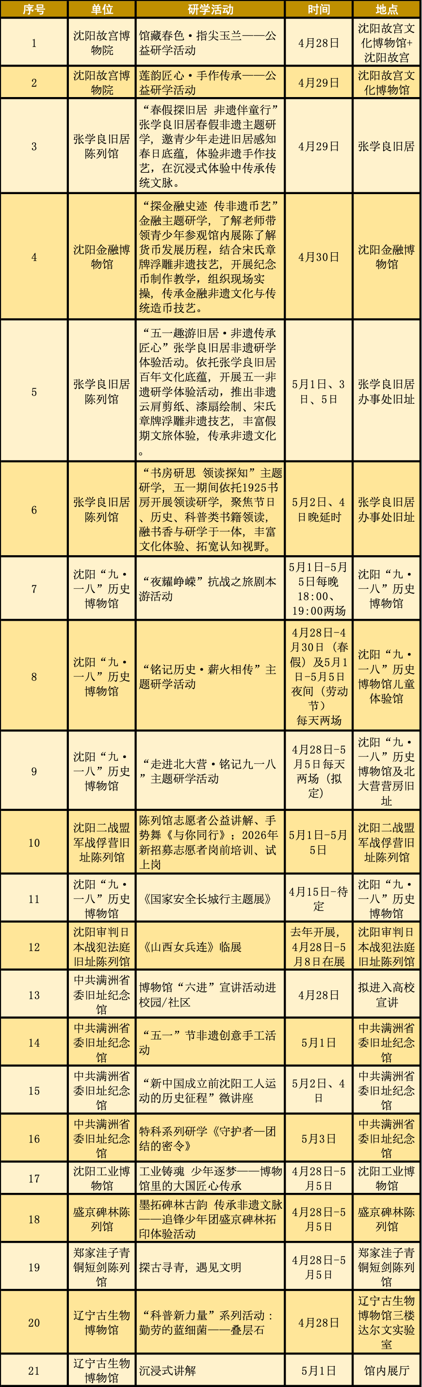 所有活动预约、优惠详情,关注沈阳文旅、沈阳市公共文化服务中心、沈阳市旅游协会官方公众号即可查询,出行前记得看好预约规则与开放时间,文明游玩、安全出行。