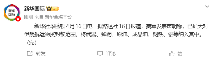 据新华社,据路透社16日报道,美军发表声明称,已扩大对伊朗航运物资封锁范围,将武器、弹药、原油、成品油、钢铁、铝等纳入其中。