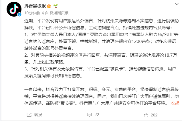 1、对“灵隐寺僧人是日本人/间谍”“灵隐寺查出军用电台”“有军队入驻寺庙/名山”等谣言纳入谣言库,处置下架、拦截新增,共清理违规内容1200余条;对多次搬运站外谣言的账号处置禁言。