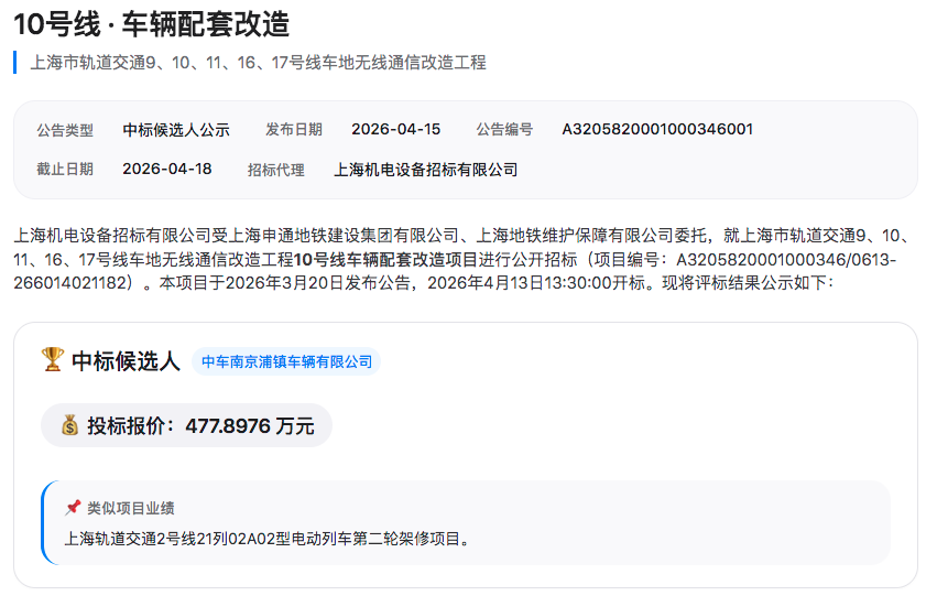10号线车辆配套改造项目,中标候选人为中车南京浦镇车辆有限公司,报价477.90万元。该线路涉及2种车型共67列车。