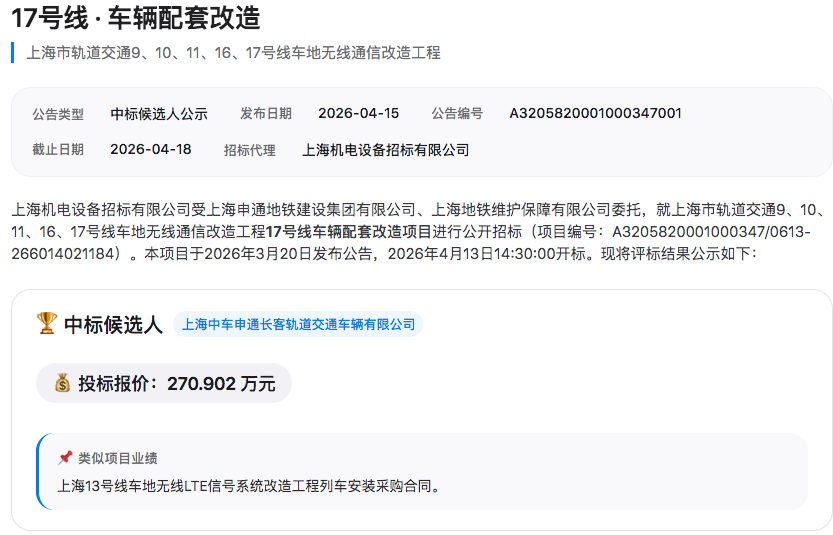 17号线车辆配套改造项目,中标候选人为上海中车申通长客轨道交通车辆有限公司,报价270.90万元。该线路涉及2种车型共38列车。
