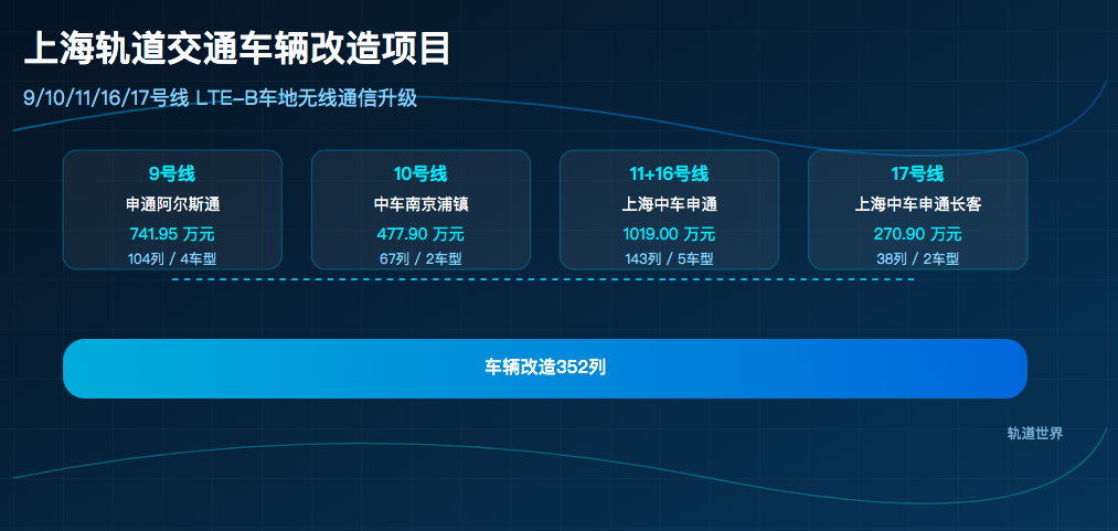 4月15日,上海市轨道交通9、10、11、16、17号线车地无线通信改造工程的车辆配套改造项目完成评标,五个标段的中标候选人同日公示。五个标段涉及列车352列,总报价约2509.75万元,平均每列车改造成本约7.13万元。