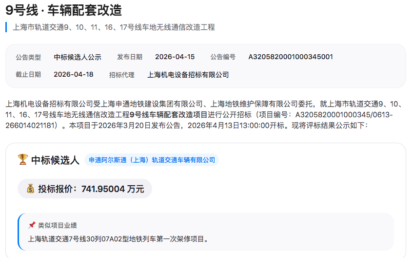 9号线车辆配套改造项目,中标候选人为申通阿尔斯通(上海)轨道交通车辆有限公司,报价741.95万元。该线路涉及4种车型共104列车。