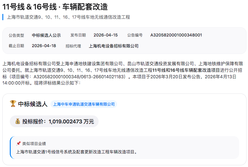 11号线和16号线车辆配套改造项目合并为一个标段,中标候选人为上海中车申通轨道交通车辆有限公司,报价1019.00万元。该标段涉及11号线3种车型82列车、16号线2种车型61列车,合计143列车。