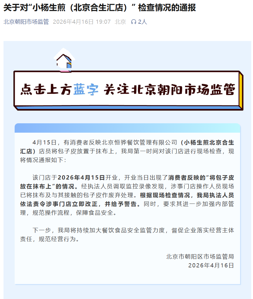 4月16日晚间,北京朝阳市场监管局发布《关于对“小杨生煎(北京合生汇店)” 检查情况的通报》,全文如下: