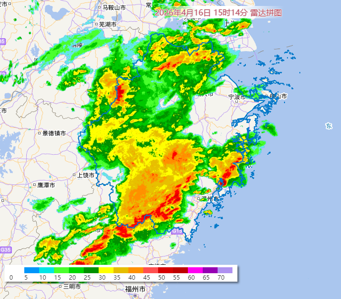 昨日午后降雨范围大大扩张,自北而南均有覆盖,其中浙南地区最为明显,15时,近1小时累计雨量最大出现在丽水庆元县五大堡乡,为35.7毫米。