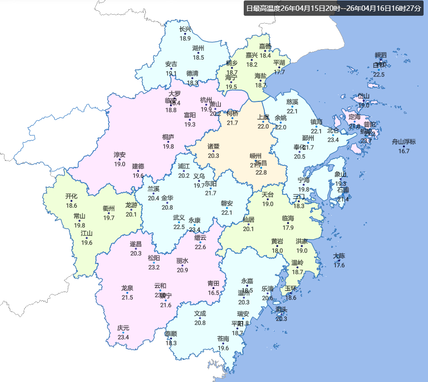 在阴雨的影响下,昨天的气温还是维持春日一贯的作风,泛着点微凉,舒适感满满,最高气温全省大部在17-23℃,北仑、庆元、永康并列第一,均为23.4℃。