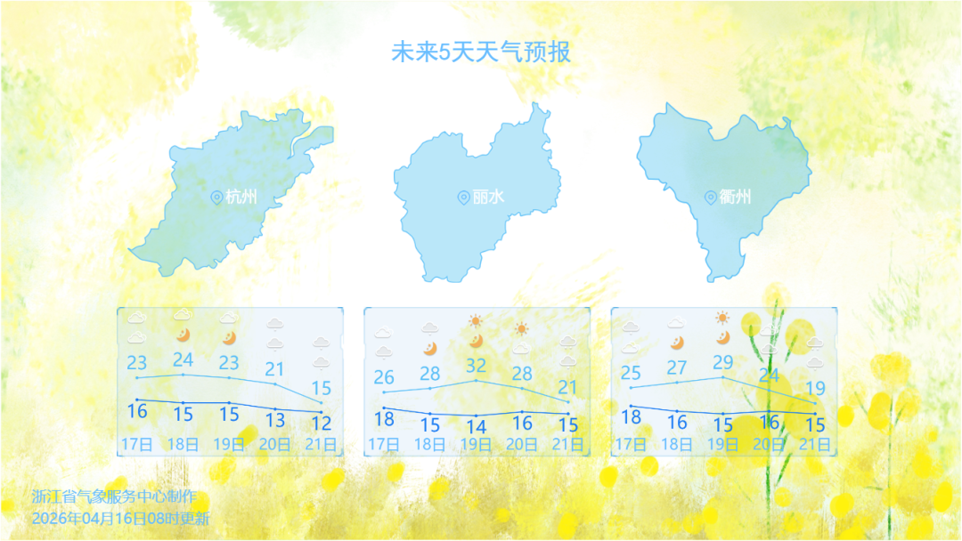 未来三天气温总体平稳,小幅爬升,其中19日浙中南地区午后气温较高,部分地区最高气温会再次向30℃发起冲击,妥妥的初夏模式“试运行”。