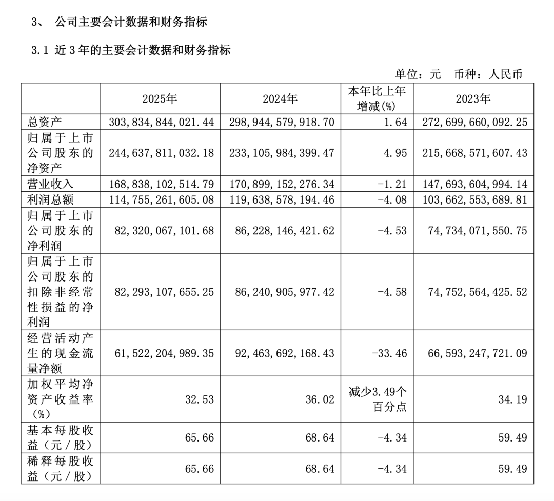 4月16日,贵州茅台(600519)公告,2025年营业收入1688.38亿元,同比下降1.21%;归母净利润823.2亿元,同比下降4.53%。