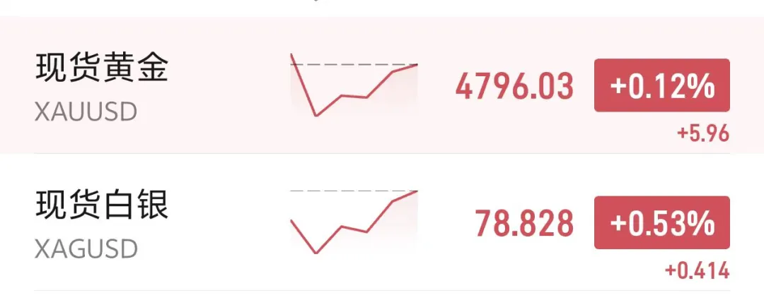 截至17日开盘,黄金白银短线拉升,现货黄金报4796美元/盎司,现货白银报78.8美元/盎司。
