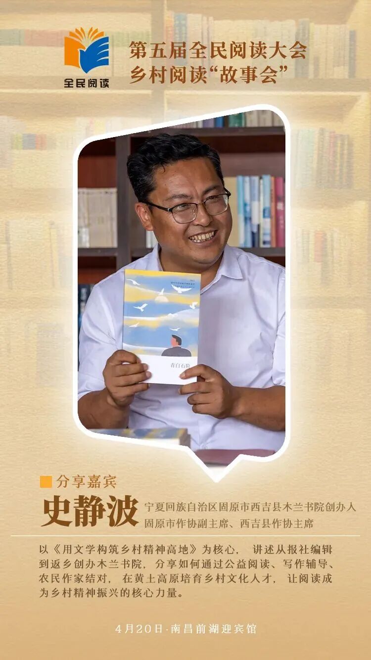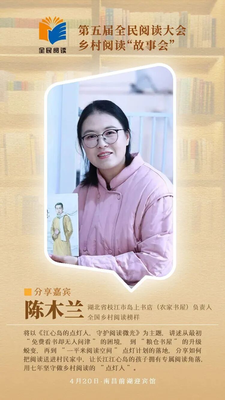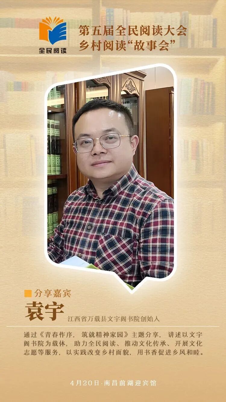 4月20日至22日第五届全民阅读大会将在江西南昌举办作为大会重点活动之一以“新乡村 新青年 新阅读”为主题的乡村阅读“故事会”将于4月20日在前湖迎宾馆举办活动特邀王计兵、赖蕾、陈木兰、周庆贵、应华亮、袁宇、史静波7位分享嘉宾