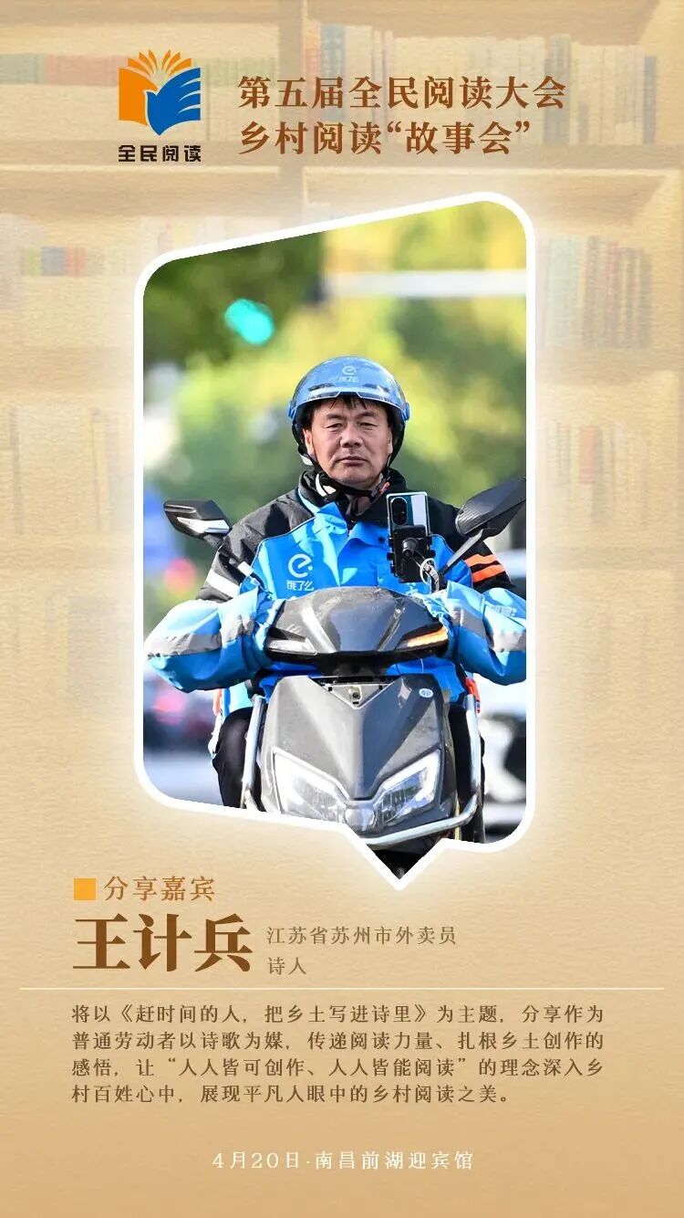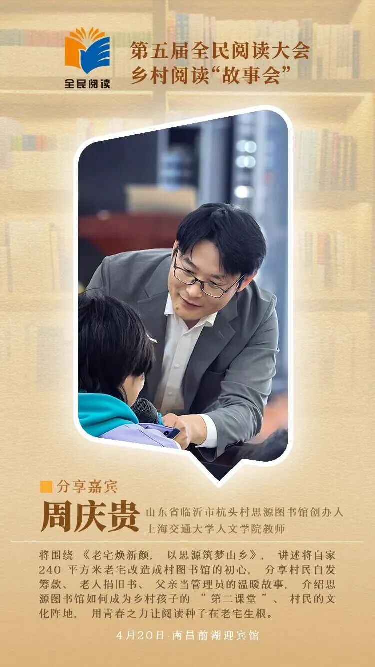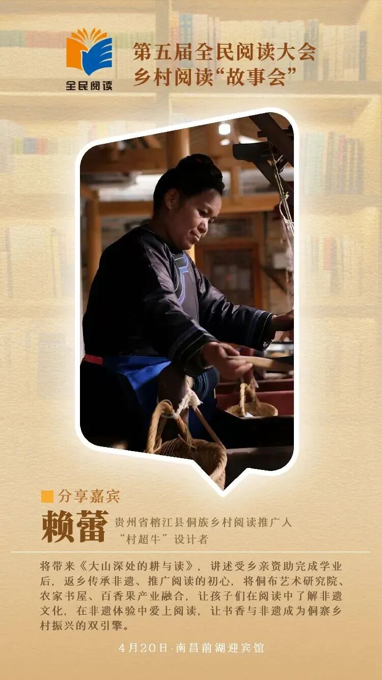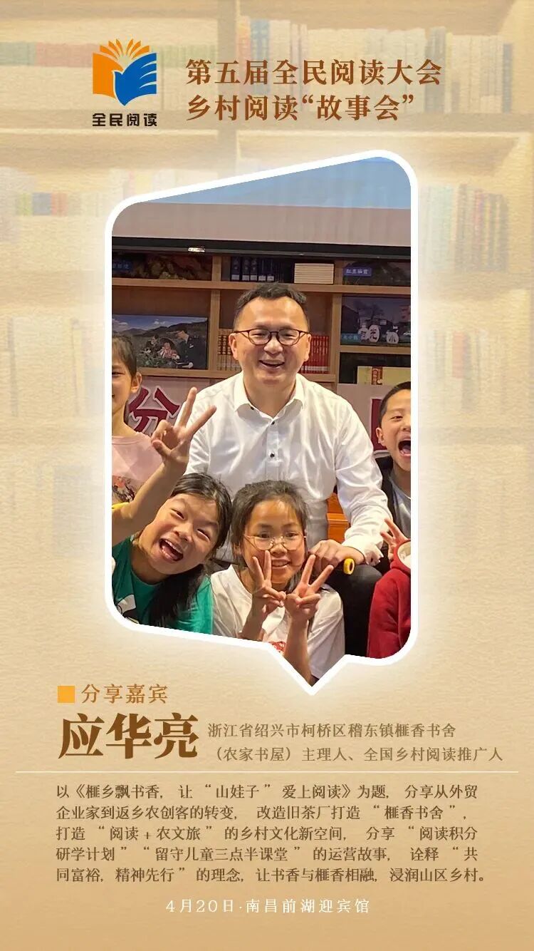 4月20日至22日第五届全民阅读大会将在江西南昌举办作为大会重点活动之一以“新乡村 新青年 新阅读”为主题的乡村阅读“故事会”将于4月20日在前湖迎宾馆举办活动特邀王计兵、赖蕾、陈木兰、周庆贵、应华亮、袁宇、史静波7位分享嘉宾