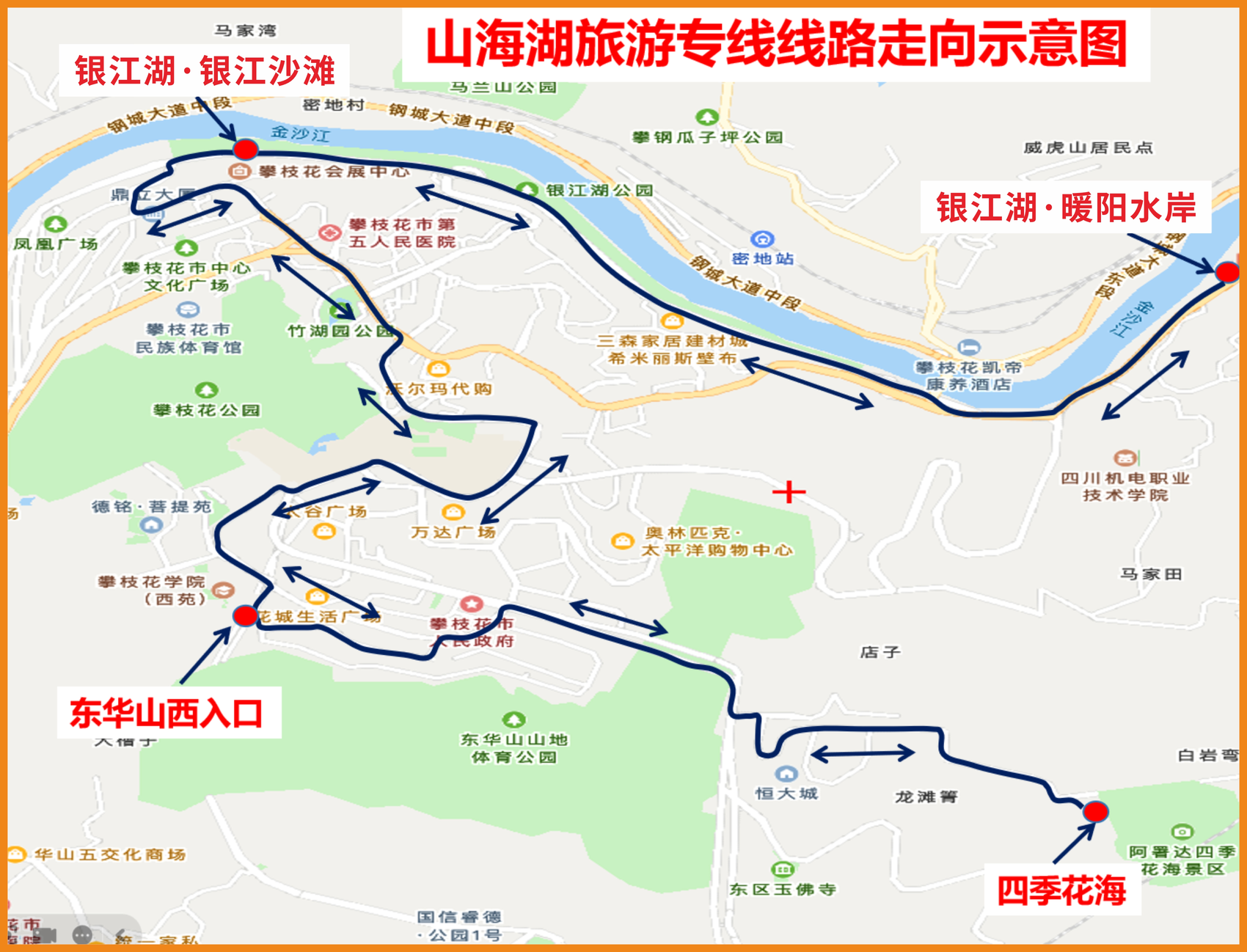 线路主要停靠站点:银江湖·暖阳水岸、尾矿路、银江湖·银江沙滩、花城下街、电影院·博爱口腔、民福巷、炳草岗大街、竹湖园·攀大附院、紫荆山、粮食局、金瓯、市三中、学府广场、攀枝花学院、学府花园·湛浩牙科、学府路、西苑、新盛路、东华山西入口、新丰路、花城外国语学校、新福路、陈家垭口隧道、龙飞路、龙腾路、双箐路、四季花海。往返一致。