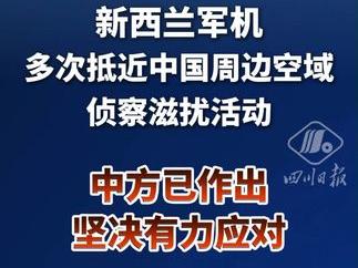 新华社北京4月17日电(记者马卓言、孙楠) 外交部发言人郭嘉昆4月17日在例行记者会上答问时表示,新西兰空军一架P-8A反潜巡逻机持续在黄海、东海海空域抵近侦察滋扰,损害中方安全利益,增加误解误判风险,也对相关空域民航飞行秩序造成严重干扰。“中方已作出坚决有力应对,并向新方提出严正交涉。中方敦促新方切实遵守国际法和国际关系基本准则,尊重中国主权和安全关切,维护民用航空安全和秩序。”