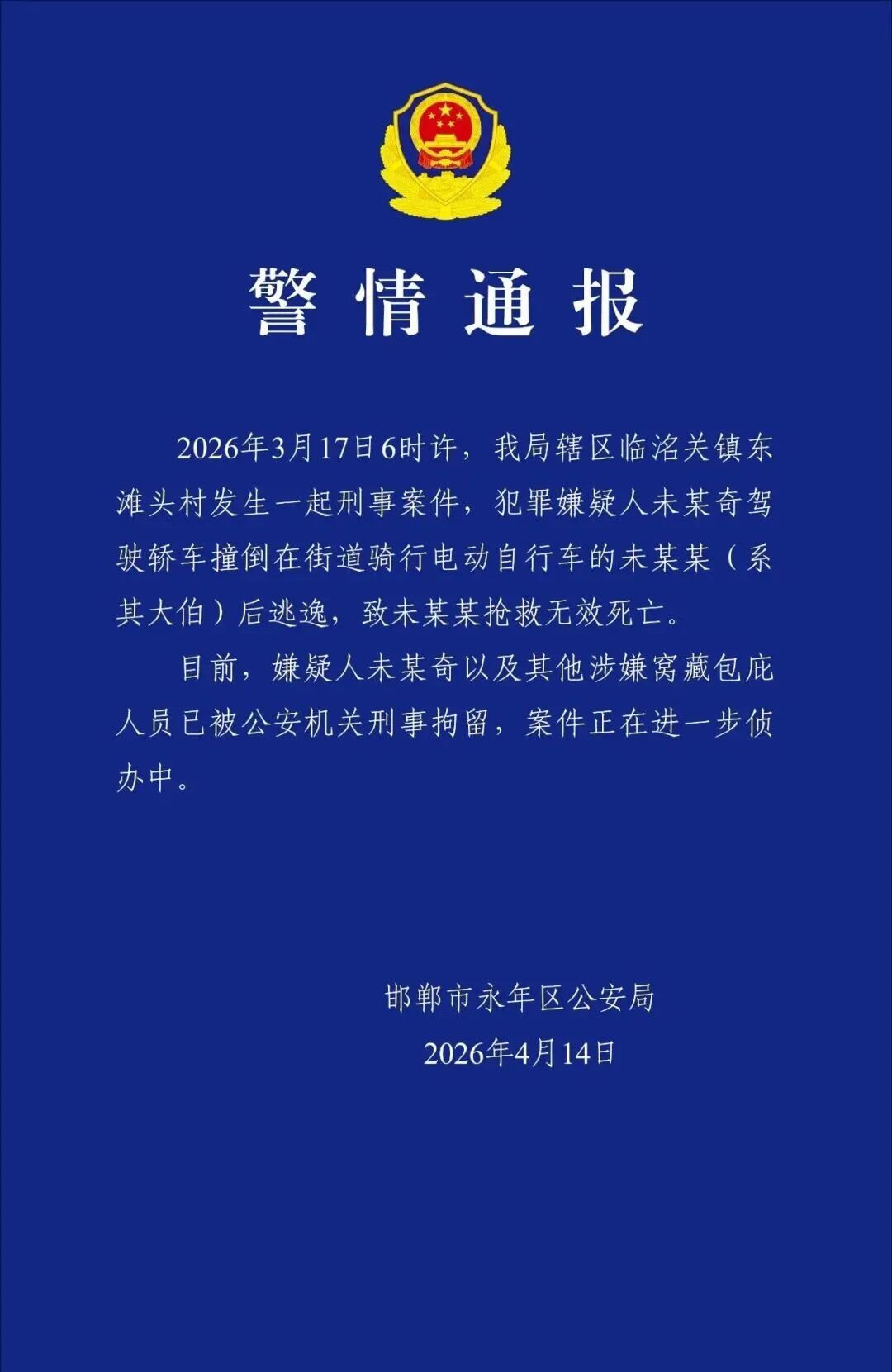 3月17日6时许,我局辖区临洺关镇东滩头村发生一起刑事案件,犯罪嫌疑人未某奇驾驶轿车撞倒在街道骑行电动自行车的未某某(系其大伯)后逃逸,致未某某抢救无效死亡。目前,嫌疑人未某奇以及其他涉嫌窝藏包庇人员已被公安机关刑事拘留,案件正在进一步侦办中。
