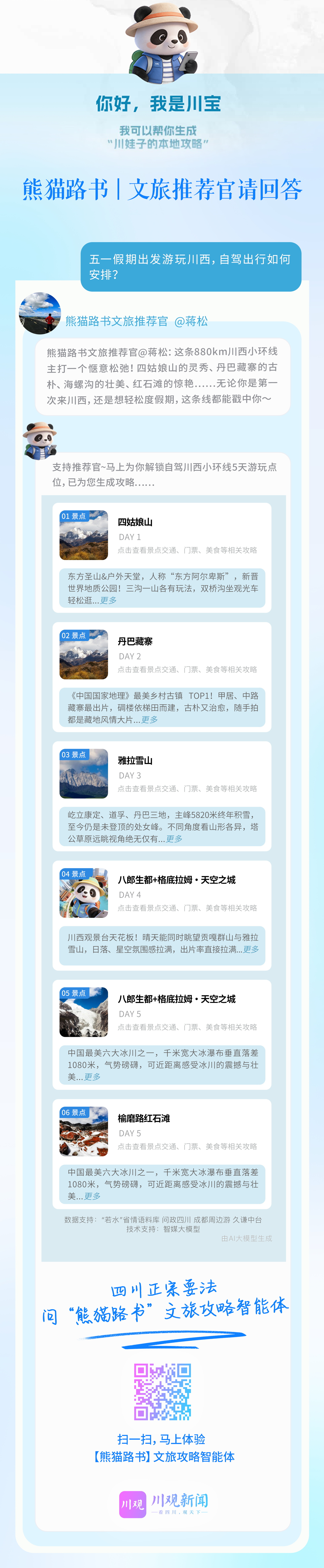 “五一”还有10天,先跟着“引路·熊猫”云游川西小环线,根据攻略提前准备好物资,预订好酒店,到点儿就出发🛫,好期待𣊬移到4.30~~