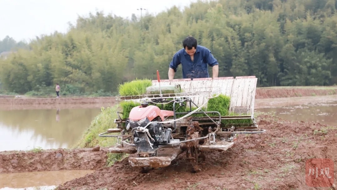 来到丘陵地貌更为典型的高县庆岭粮油现代农业园区,专为丘陵地形设计的手扶式水稻插秧机正大显身手。“以前10个人干一天的活,现在2个人半天就能完成,不弯腰、不费力,效率高、质量还好!”插秧机手周明海站在田埂边笑着说。