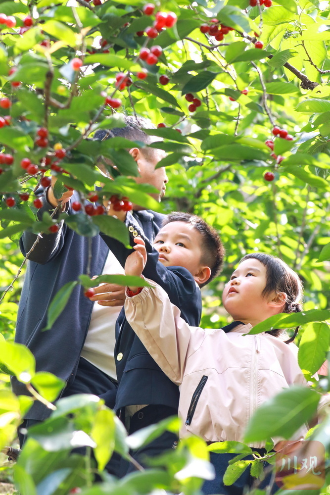 当天,住在成都的“回头客”张光红,趁放春假和两家亲朋好友驱车来汉源采摘小樱桃。他说:“知道汉源小樱桃也好吃,特地打电话请熟悉的果商留了几棵樱桃树,让孙儿们体验下大自然采摘的乐趣。”在樱桃林间,孩子们在家长的带领下,轻轻摘下树上新鲜的红樱桃,小心放入篮中,洗净后就可以品尝。