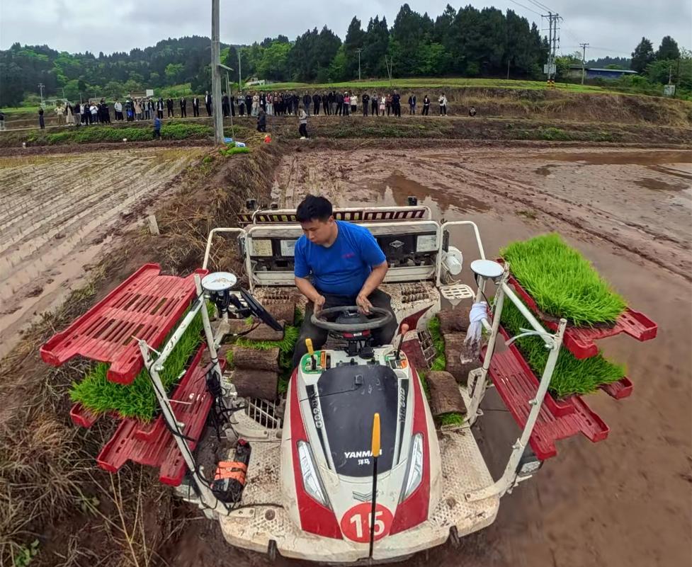 遂宁射洪市明星镇大明村玲薇家庭农场再生稻示范基地里,数十名种植大户、家庭农场主站成一排,目光投向田中央。一个皮肤黝黑、眼神明亮的年轻人正操纵自动插秧机穿梭往来,滚轮转动处,一排排秧苗整齐扎进沃土。