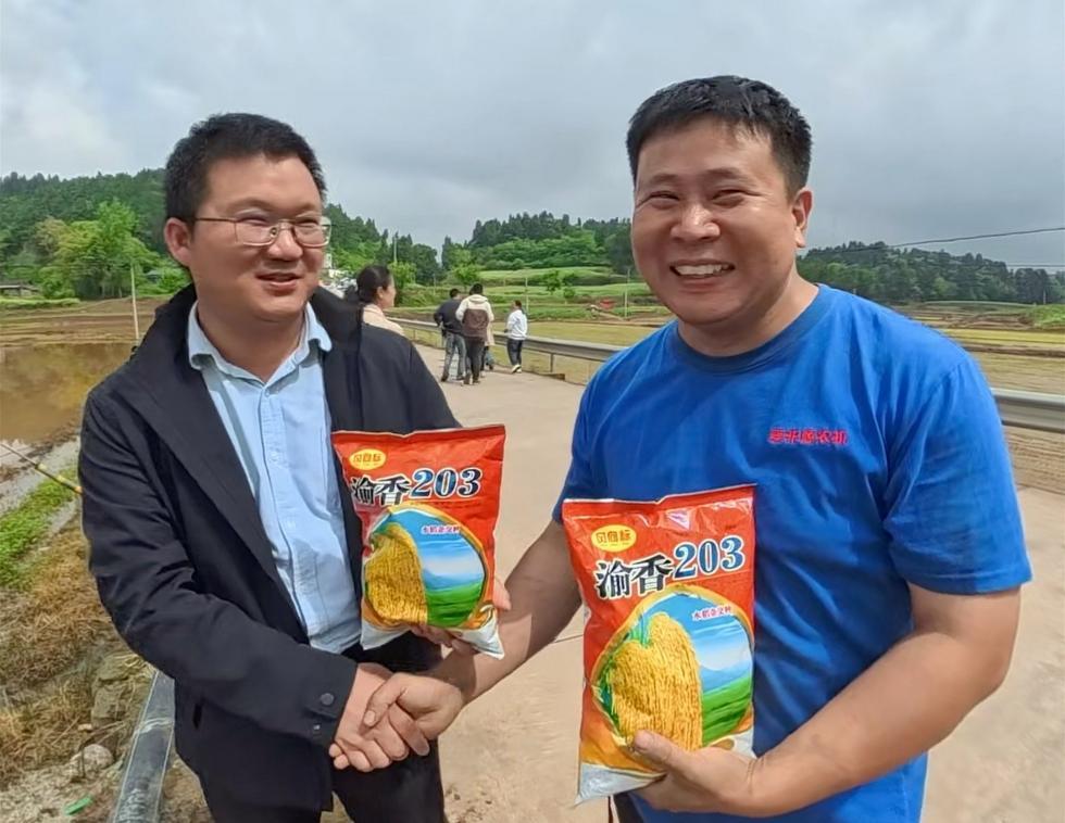 张巫军向徐伟(右一)赠送渝香203稻种。