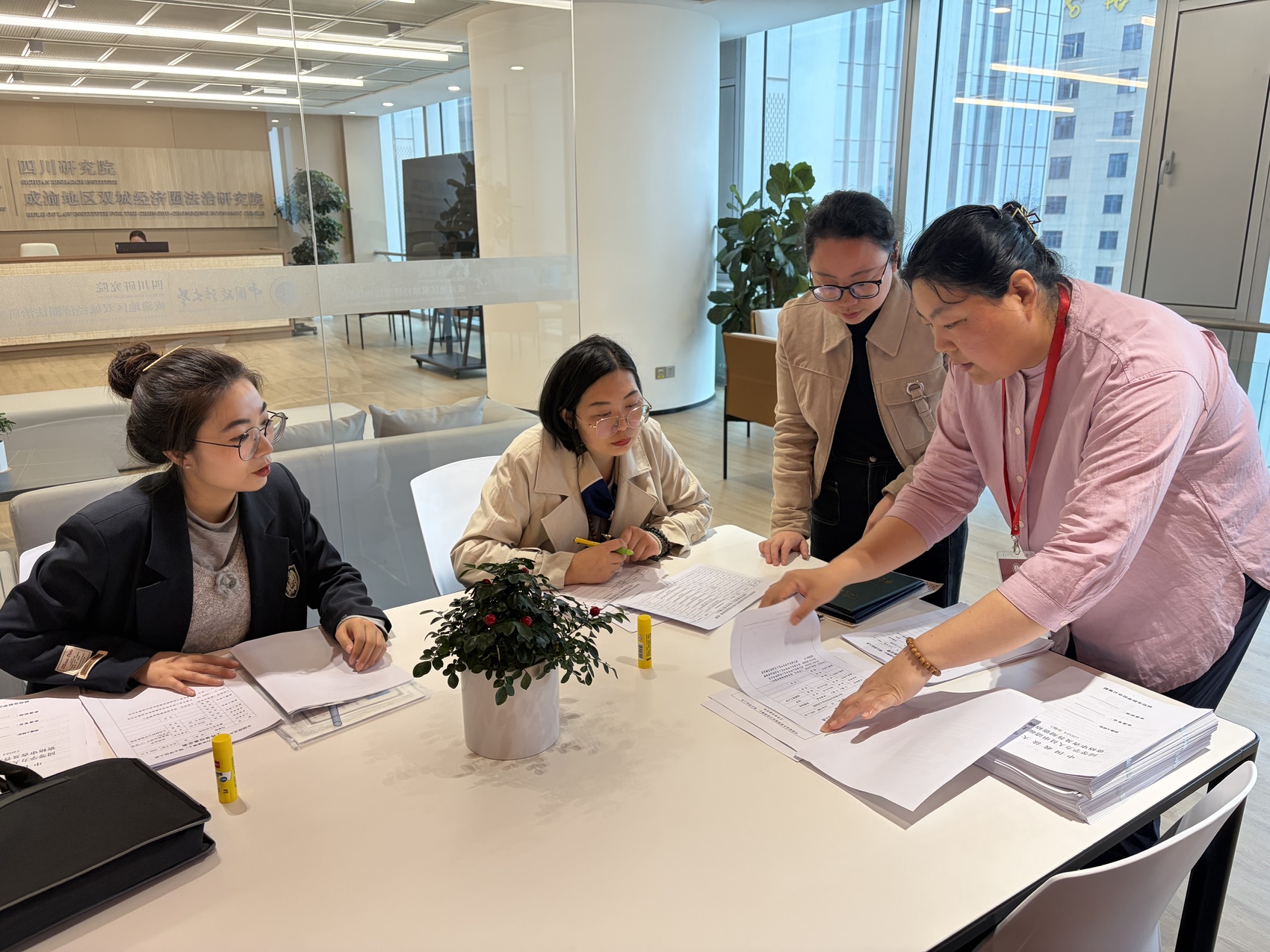 中国政法大学四川研究院内,大家正在商讨工作。(卢云开 摄)