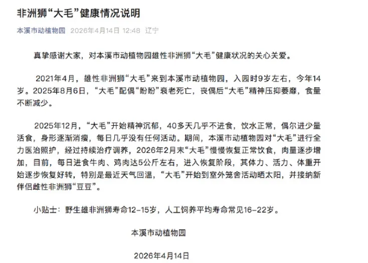 4月14日,辽宁本溪市动植物园发布情况说明称,2021年4月,雄性非洲狮“大毛”来到本溪市动植物园,入园时9岁左右,今年14岁。2025年8月6日,“大毛”配偶“盼盼”衰老死亡,丧偶后“大毛”精神压抑萎靡,食量不断减少。