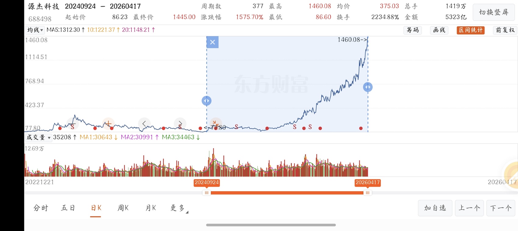 对比一下数据:自2024年9月底至今,贵州茅台股价累计上涨20%,而源杰科技的涨幅接近1500%——短短半年多时间,股价实现了十五倍飙升。