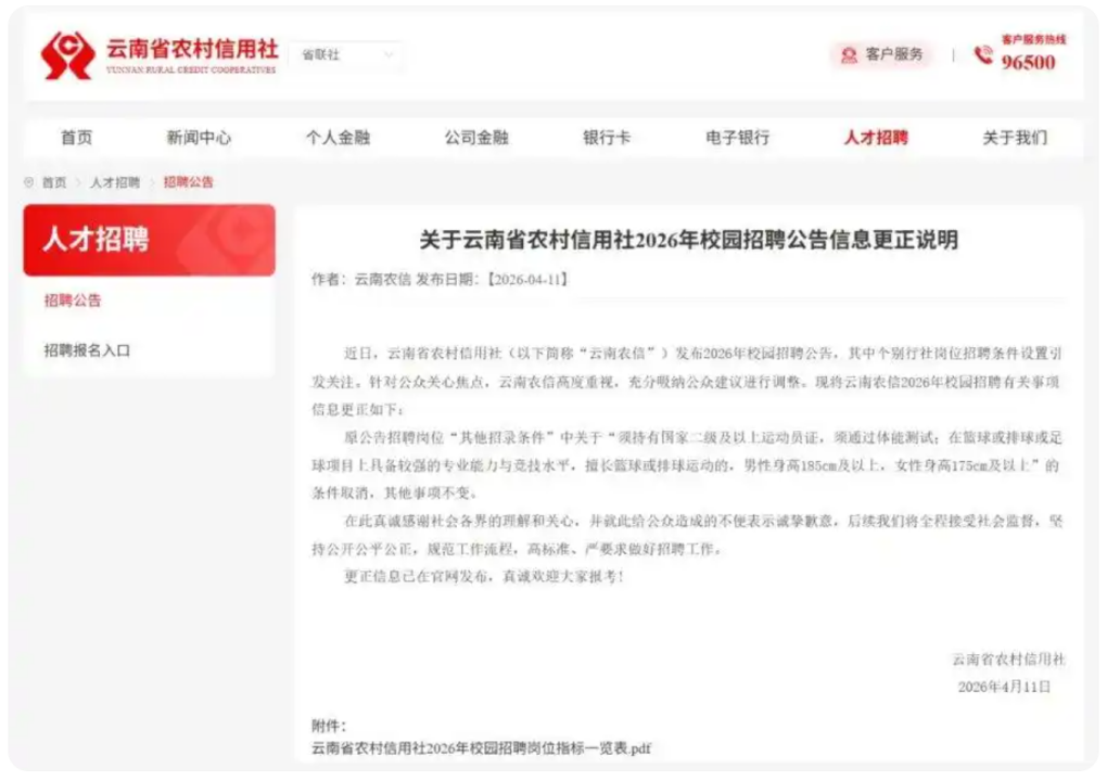 4月11日,云南省农村信用社官网发布《关于云南省农村信用社2026年校园招聘公告信息更正说明》,正式回应招聘争议。涉事银行宣布取消2026年校园招聘中部分营业网点岗位设置的“国家二级运动员证、体能测试、身高限制”等特殊要求,其他招录事项保持不变。