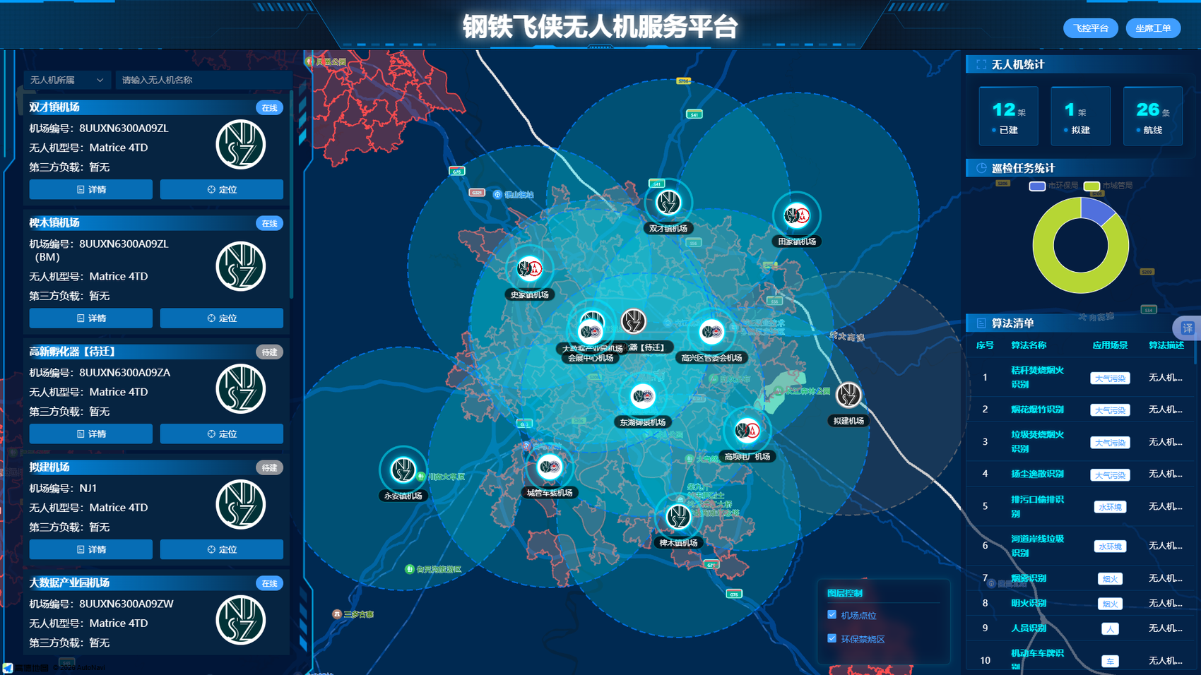 2025年底,内江“钢铁飞侠”无人机服务平台投用,该平台构建“11固定+1移动”机场网络,配备12台无人机,规划航线160条,可对主城区及周边约700平方公里,进行大气污染防治、河道防汛、林地资源、城市管网等巡检、监测。