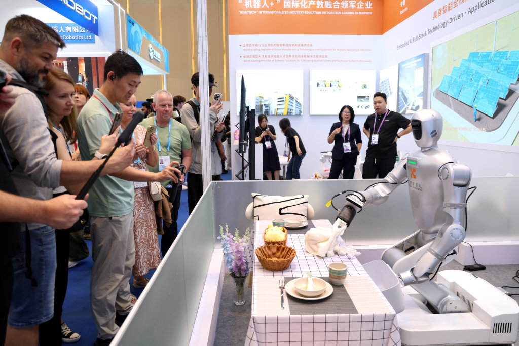 4月15日,境外采购商在广交会上观看机器人模拟收拾餐桌。