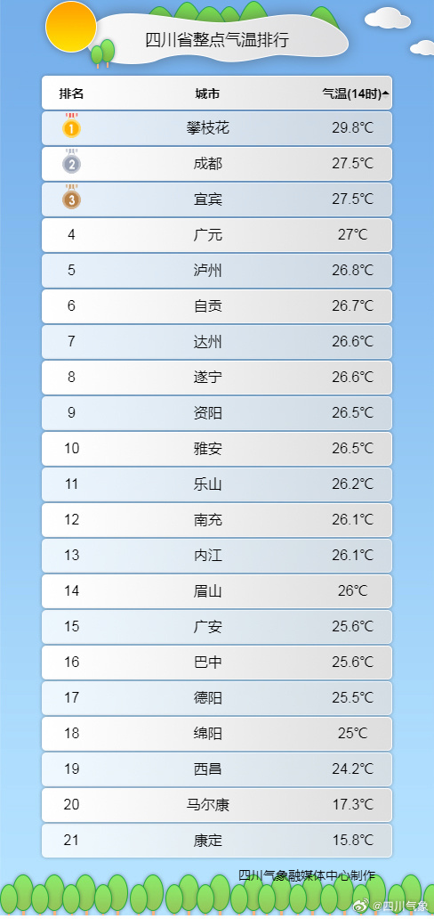 今天,成都、绵阳、乐山等多个四川城市阳光早早上线,又是一个大晴天。气象实况观测显示,今天14时四川盆地各城市气温均达到25℃以上。