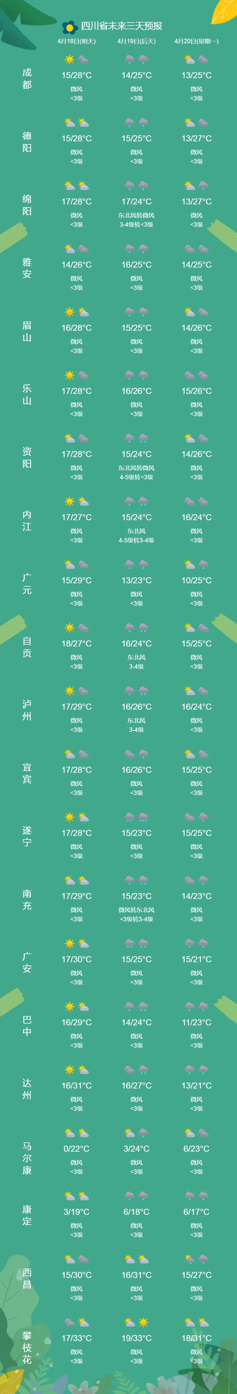 明天(4月18日),四川全省整体上还将延续今天的晴好天气。预计全省大部地区以晴间多云天气为主,盆地白天气温还要往上冲,各城市最高气温为28~31℃,紫外线较强,不过要注意早晚偏凉,昼夜温差大。其中,明天白天,凉山州北部局地有阵雨或雷雨。