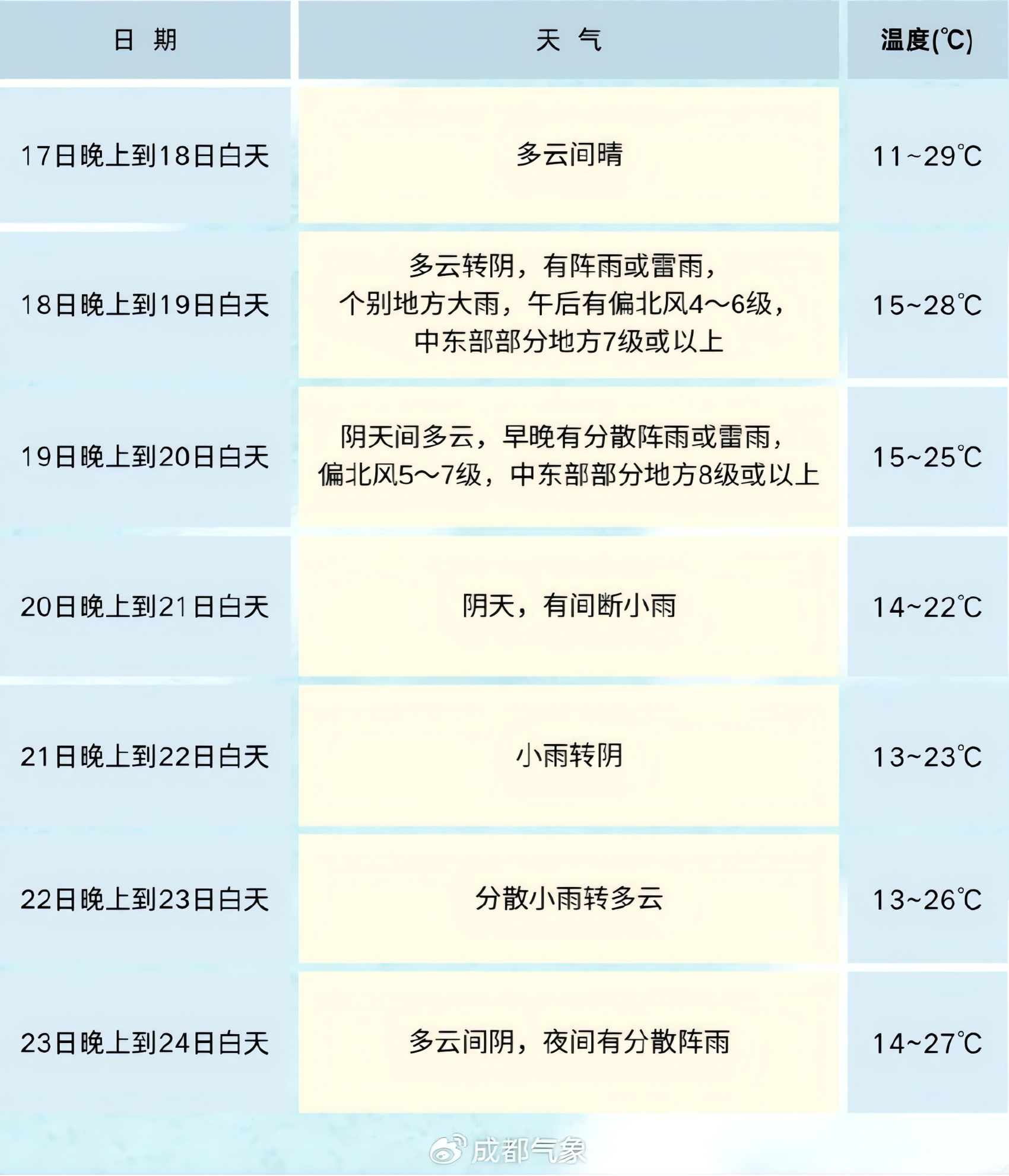 成都市气象局今天也作出重要提示:受高空槽和地面冷空气共同影响,19日至21日,成都市有一次较明显的强对流及降温天气过程,日平均气温累计下降4~6℃;19日午后到晚上有阵雨,个别地方有大雨,并伴有阵性大风、雷电和分散短时强降水等强对流天气,全市普遍有5~7级偏北风,中东部部分地方8级或以上。21日冷空气影响基本结束,转为多云间阴天气,早晚多分散阵雨,白天气温回升较快。