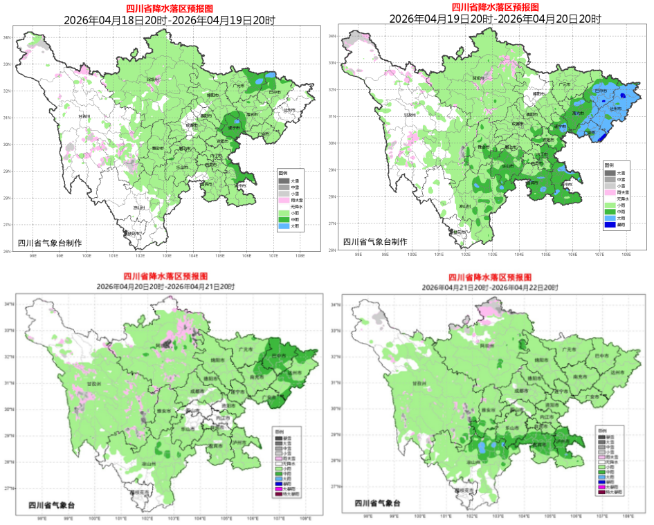 ▲ 20日至21日,盆地大部阴天间多云有阵雨或雷雨,东北部和南部局地中到大雨;川西高原和攀西地区大部有阵雨或雷雨,川西高原北部东部和凉山州东北部局地有中到大雨或大雪。